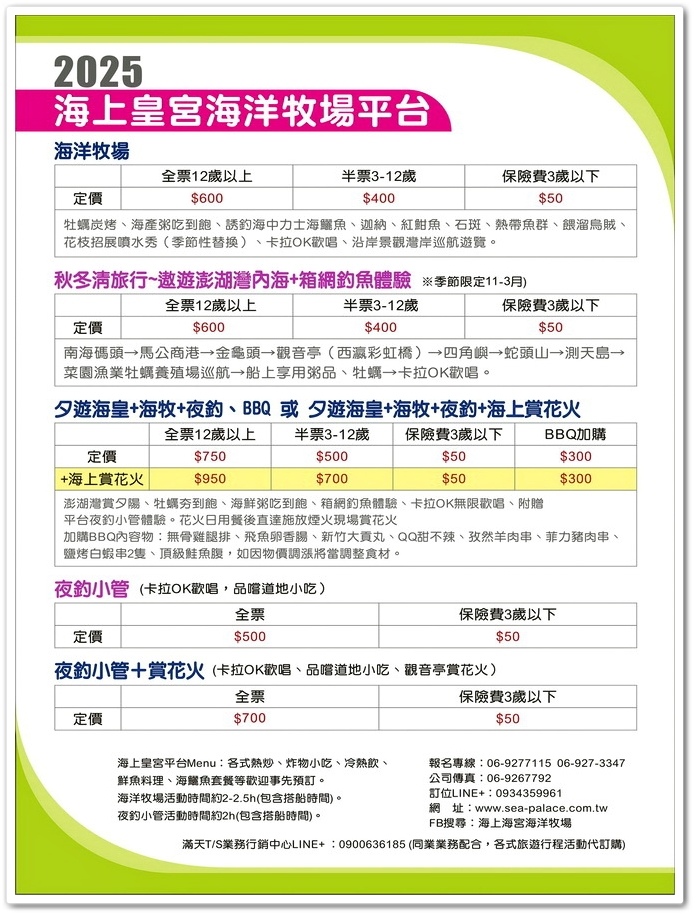 4.海上皇宮海上牧場 06-927-7115、海上牧場、夜釣小管等套裝遊程