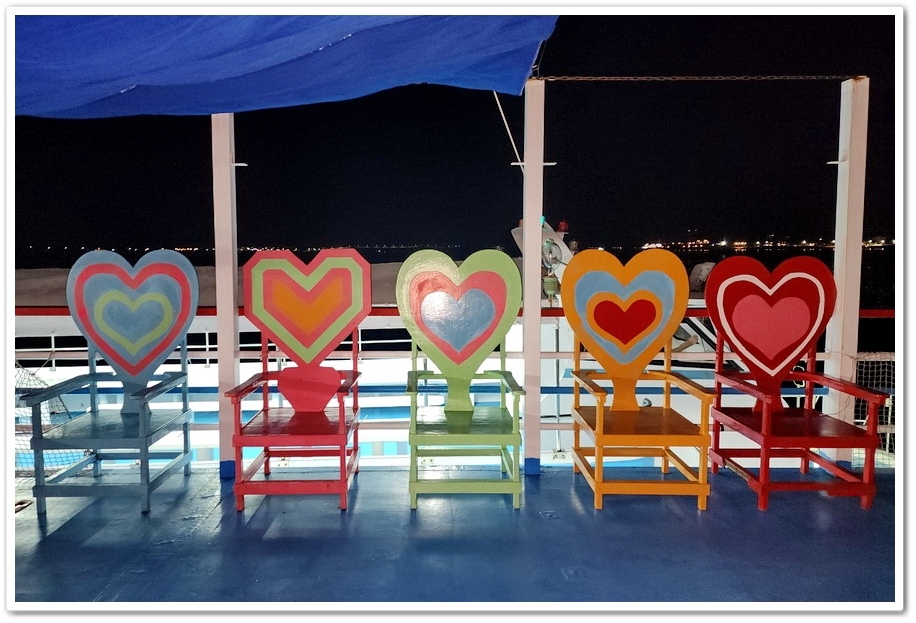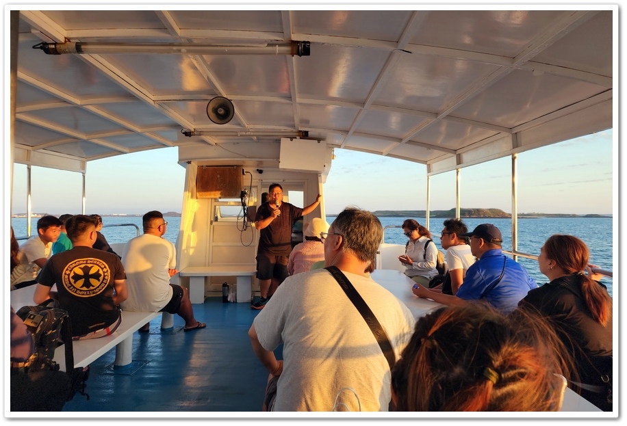 ▲ 『海上明珠2號』船隻二樓為開放性船艙,配備有解說人員,船隻在行駛中,傍晚的晚風吹來好舒服,如果旅人怕暈船的話,也可以坐在一樓船艙,但我們都挑坐在二樓,可以順便賞風景!