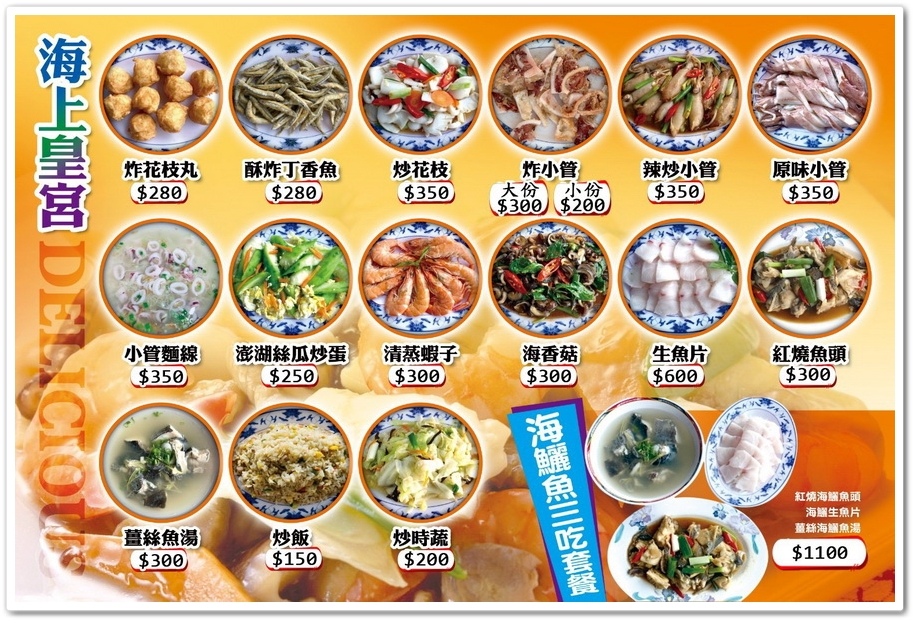 ▲ 這是『海上皇宮海洋牧場』官網的價目表,有炸花枝丸、炒花枝、炸小管、辣炒小管、小管麵線、澎湖絲瓜炒蛋、清蒸蝦子、炒海香菇、生魚片、紅燒魚頭、薑絲魚湯、炒飯、炒青菜,還有海鱱魚三吃套餐等等,菜色豐富!不怕你吃不飽!