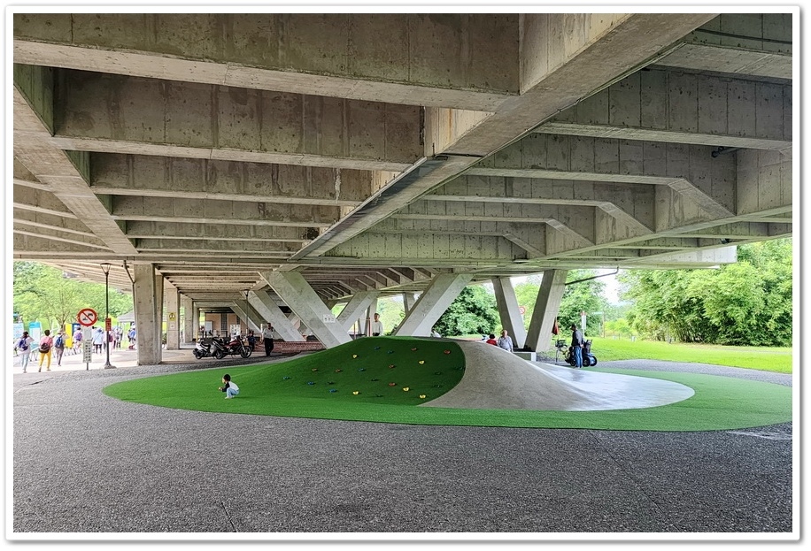 高架橋下作為一座島的概念延伸,在材料上運用近乎自然的『人工草皮』,作為與外在農業地景相對應。另一種主要呈現,創造出在高架橋下,也可以有著大片綠地,綠色地景的空間感。小朋友都特愛這區位於橋下的磨石子溜滑梯,人工草皮的場地,需要脫鞋子才能進入遊玩,小小孩都在這邊玩到不想走!